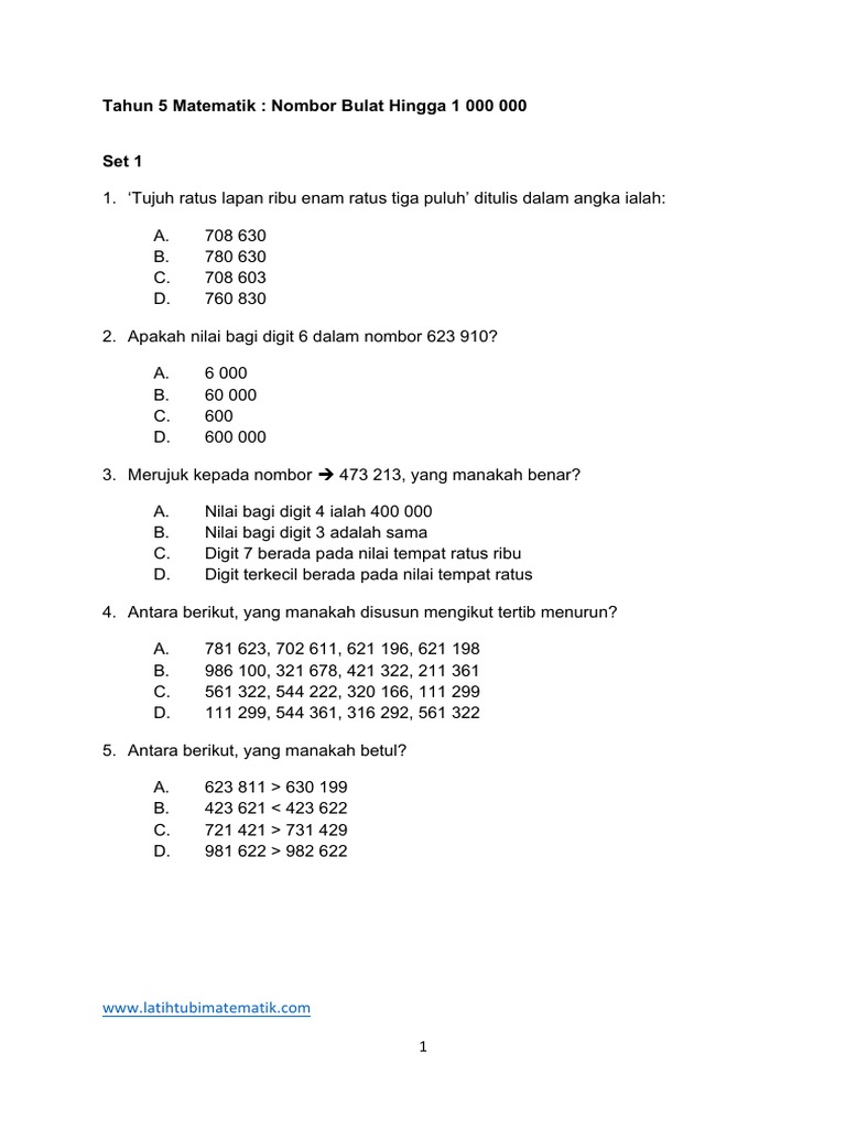 Tahun 5 Nombor Bulat Hingga 1000000 Set 1 Pdf